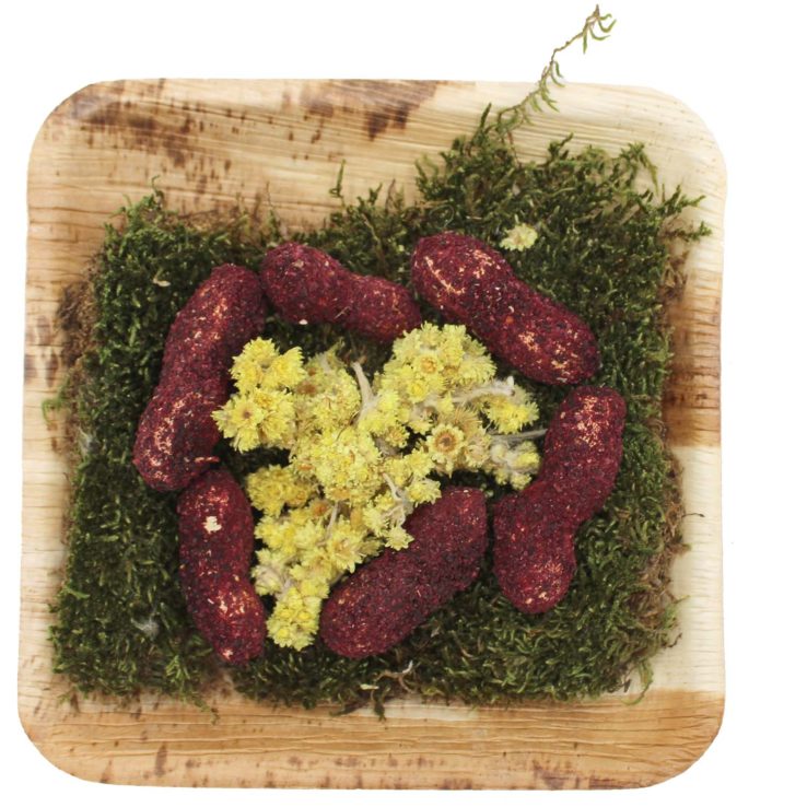 Ganze Erdnüsse (ummantelt mit roter Beete), Moosflocken, Sand-Strohblume, Palmblatteller