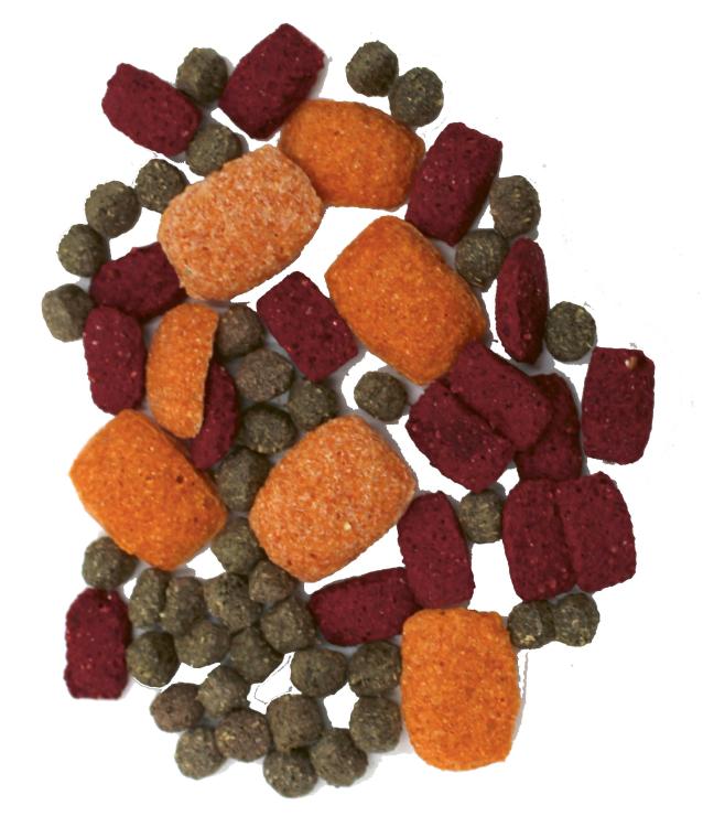 Zusammensetzung: Gemüseperlen: Mais, Erbsen (34,5%), Luzerne 20%, Maiskeime; Karottenkissen: Mais, Karotten (10%), Lecithin; Rote Beete-Kissen: Mais, Rote Beete (25%), Reis